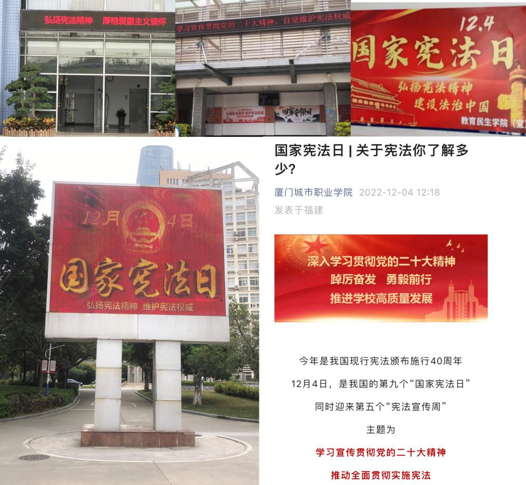 围绕“学习宣传贯彻党的二十大精神,推动全面贯彻实施宪法”这一主题,以学校微信公众号、LED电子屏、校园广播、橱窗等为载体,推送专题推文,播放展示专题标语、图片、语音及视频,全方位宣传介绍,在全校营造浓厚的国家宪法日学习氛围,提升国家宪法日在师生中的知晓率。