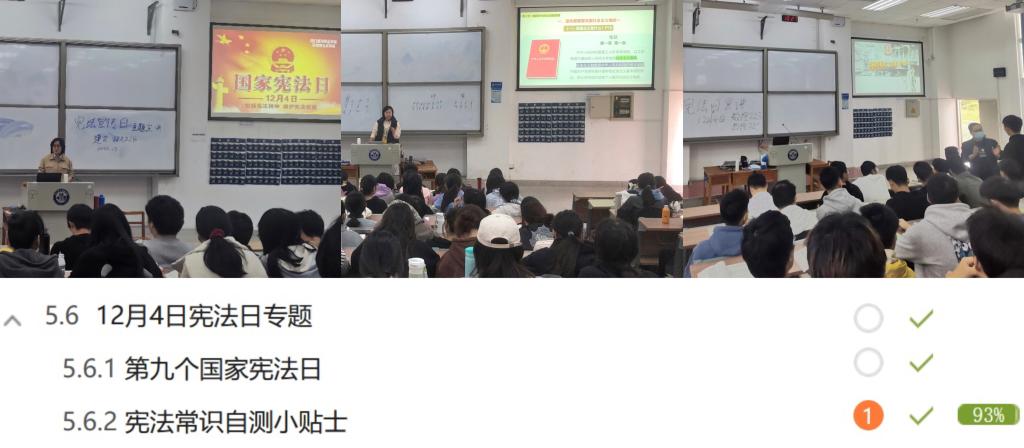 马克思主义学院发挥自身优势,在思想政治理论课教学中融入宪法教育,深入宣传习近平法治思想的重大意义、丰富内涵、核心要义、精神实质及实践要求。聚焦身边人、身边事,从小切口入手,以小见大、以点带面阐释现行宪法施行四十年来维护人民群众合法权益、保障社会公平正义、推动国家发展进步的生动实践。重点宣传中国共产党领导是中国特色社会主义最本质的特征、是中国特色社会主义制度的最大优势,教育青年学子听党话、感党恩、跟党走,厚植爱党爱国爱社会主义的情感。并在线上超星学习通资源库中增加国家宪法日学习专题,通过教师讲授、学生自学自测,线上与线下同向发力,引导学生不断增强宪法意识、自觉弘扬宪法精神、坚决维护宪法权威,努力在宪法的阳光照耀下茁壮成长。